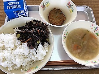 | ☆11月14日(火) 《献立》 ・セルフひじきごはん(ごはん、ひじきごはんの具)、ぎょぎょてんぷら、米粉のだご汁、牛乳 《献立ひとくちメモ》 ・ぎょぎょてんぷらは、白身魚とイワシの2種類のすり身を使って作った八代オリジナルのてんぷらです。すり身の中に、にら・ごぼう・にんじんなどの野菜を加え、食べやすいようにカレー粉で味付けしてあります。 【ひじきをごはんに混ぜて食べました】 |