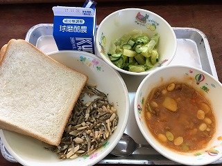 | ☆11月15日(水) 《献立》 ・食パン、ポークビーンズ、菜果サラダ、いりこスナック、牛乳 《献立ひとくちメモ》 ・噛むときには、あごの筋肉を動かします。このあごの筋肉を動かすたびに、まわりの血管や神経が刺激されって、脳の血流もよくなり脳に酸素が届きやすくなります。そうすることで、脳の働きが活発になり、記憶力や集中力がよくなるといわれています。いりこやアーモンドの入ったいりこスナックをしっかりかんで食べましょう。 【いりこスナックを噛んで、脳が元気になったかな】 |