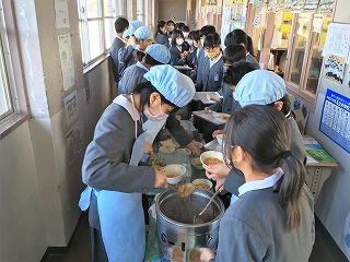 【6年生の給食配膳の様子です】 ・人数が多くて、廊下に給食台を出してつぎ分けます。 |
