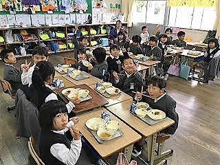 【3年A班の給食の様子】 ・女の子と男の子に分かれてグループを作って食べていました。 |
