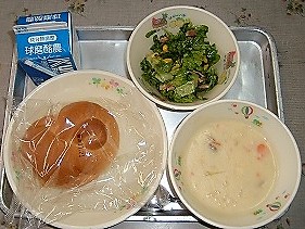 | ☆11月6日(月) 《献立》 ・黒糖パン、ポテトのスープ、ハンバーグのデミソースかけ、グリーンサラダ、牛乳 《献立ひとくちメモ》 ・今日のグリーンサラダには、サニーレタスやグリーンリーフなどの緑色の野菜を使っています。グリーンリーフはレタスの仲間ですが、レタスより色が濃いので、10倍のカロテンや4倍のビタミンCが含まれています。八代では、冬場に多く作られている野菜です。 【食べておいしく、見た目もきれいな給食でした】 |