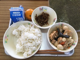 【1年2組の給食の様子です】 ・みんな食べるのに夢中でした。鶏肉は、子どもたちに人気のあるメニューです。 |