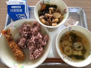 | ☆11月24日(金) 《献立》 ★和食を味わう献立の日 ・赤飯、煮しめ、すまし汁、えびフライ、牛乳 《献立ひとくちメモ》 ・今日は、「和食を味わうの日・ふるさと元気っ子メニュー」です。「ふるさと元気っこメニュー」では、毎月19日の「食育の日」に合わせて、八代地域や県内でとれる食材を使った料理や伝統料理、郷土料理などを実施しています。食事を通して、ふるさとを愛する心を育てたいと考えています。また、今日は11月24日の「和食の日」にあわせて、和食を味わう献立の日の取組も同時に行います。九州三大祭りの一つのである妙見祭が11月23日に開催されたことから、お祭りやお祝いの時に作られる赤飯と煮しめの給食を実施します。お祭りにちなんだ「妙見お祭りメニュー」です。 |