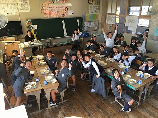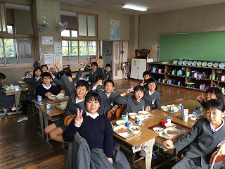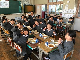 【4年1組の給食の様子】 ・みんなナイスポーズで写ってくれました。給食はみんなを笑顔にしてくれますね。 |