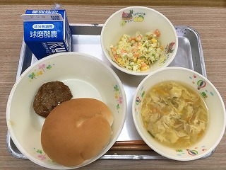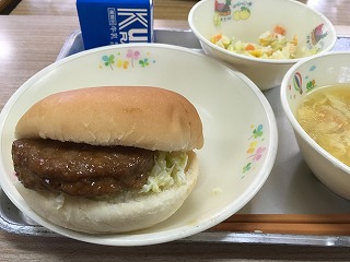 | ☆11月29日(水) 《献立》 ・セルフ照り焼きチキンバーガー、(バーガーパン、コールスローサラダ、照り焼きチキン)、卵スープ、牛乳 ※給食の変更?ハンバーグだったような… 《献立ひとくちメモ》 ・鶏肉は、良質のたんぱく質を豊富に含み、牛肉や豚肉と比べて脂肪が少ないのが特徴です。また、ビタミンAも豊富で、牛肉や豚に宇野数倍含まれています。ビタミンAは、粘膜を強くし、細菌感染を防ぐ働きがあります。 ↓↓↓↓↓パンにハンバーグを挟んで食べました。 【セルフバーガーはおいしかったです】 |