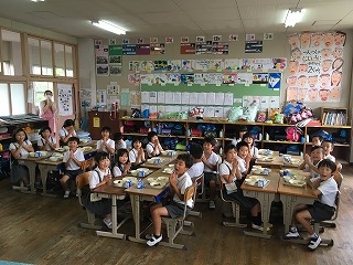| ☆6月14日木曜日 《献立》 ・麦ごはん、中華スープ、魚の香味だれ、一食焼きのり、杏仁豆腐、牛乳 《献立ひとくちメモ》 ・わかめには、体の新陳代謝を活発にするヨウ素が多く含まれています。ヨウ素には、心を落ち着かせて、心身を元気にする効果があります。さらに、カルシウムが含まれているので、骨を丈夫にします。 【6年1組の様子】 ・給食の準備中。ALTのジョー先生も一緒に給食をたべました。 |