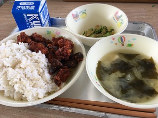 | ☆6月15日金曜日 《献立》 ・麦ごはん、みそ汁、鶏とレバーのバーベキューソース、ハリハリあえ、牛乳 《献立ひとくちメモ》 ・レバーには、ビタミンAという栄養がたくさん含まれています。ビタミンAは、のどの粘膜を強くし、かぜなどの病気の菌が体の中に入るのを防いでくれます。ほかにも、ビタミンBや鉄などの栄養も含まれています。今日は、みなさんが食べやすいように鶏肉とあわせて、カレー粉のきいたバーベキューソースであえています。 【6年2組の様子】 ・体育のあとは、お腹も減ります。みんなおかわりをして、たくさん食べていました。 |