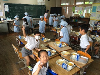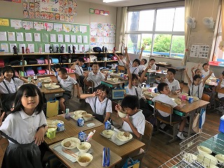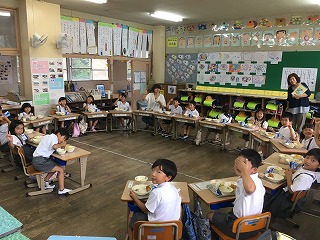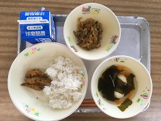 | ☆6月5日(火) 《献立》 ・セルフまぜごはん、すまし汁、小いわしフライ、牛乳 《献立ひとくちメモ》 ・いわしには、まいわし、かたくちいわし、うるめいわしなどの種類がありますが、普通いわしというと、まいわしをさします。いわしには、カルシウムとその吸収を助けるビタミンDの両方が含まれています。また、生活習慣病の予防効果がある不飽和脂肪酸も多く含まれています。 【2年1組の様子】 ・手を合わせて、いただきます! |