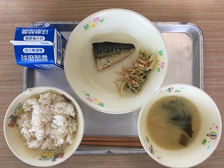 | ☆6月1日(金) 《献立》 ・麦ごはん、みそ汁、さばの塩焼き、ごまあえ、牛乳 《献立ひとくちメモ》 ・豆腐は、大豆のしぼり汁(豆乳)を固めて作ります。「畑の肉」と呼ばれる大豆から作るため、豆腐も肉と同じようにたんぱく質の多い食品です。大豆が原料の食べ物には、ほかにも油揚げ、がんもどき、きな粉、みそ、しょうゆなど、いろいろあります。 【1年1組の様子】 ・大きな円を作って給食を食べます。みんなの顔が見えていいですね。 |