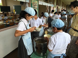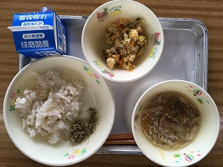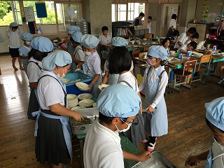 | ☆6月26日火曜日 《献立》 ・麦ごはん、なめこのみそ汁、かぼちゃのうま煮、手作り佃煮、牛乳 《献立ひとくちメモ》 ・いりこは、かたくちいわしをゆで、乾燥させたものです。主にだし用に使われますが、うま味成分のイノシン酸が多く含まれているので、そのままでもおいしく食べられます。骨ごと食べるとカルシウムもたっぷりです。いりこをかつお節や昆布、ごまとあわせた手作り佃煮は、栄養満点です。 【4年生の給食の様子】 ・4年教室横の算数教室で準備をします。 |
