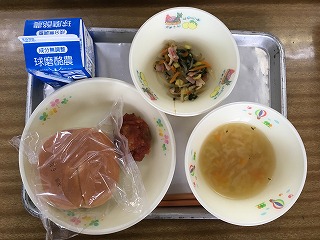 | ☆6月20日水曜日 《献立》 ・ココアパン、トマト団子のスープ、豚肉のマスタード焼き、甘夏サラダ、牛乳 《献立ひとくちメモ》 ・今日のスープには、トマトを練り込んだ団子が入っています。トマトには、うまみ成分のグルタミン酸が多く含まれており、加熱することで甘みやうま味が増します。鮮やかなピンク色の団子が、見た目にも食欲をそそります。味わって食べてください。 【2年1組の様子】 ・いつもおいしく給食をいただいています。 |