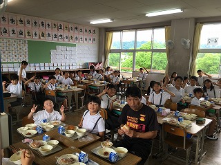 | ☆6月8日(金) 《献立》 ・麦ごはん、豆腐ハンバーグのごまみそだれ、沢煮椀、かみかみサラダ、牛乳 《献立ひとくちメモ》 ・みなさんは、食べ物を食べるとき、何回ぐらいかんでから飲み込んでいますか?かみかみサラダには、さきいかやごぼう、キャベツなど、かみ応えのある食べ物がたくさん入っています。かむ回数は、食べ物によって変わります。かむ力をつけるためには、材料や切り方などを工夫しましょう。 【3年2組の様子】 ・おいしく食べていました。はい、チーズ! |