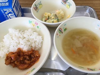 | ☆10月3日水曜日 《献立》 ・セルフチキンライス、野菜スープ、ポテトサラダ、牛乳 《献立ひとくちメモ》 ・じゃがいもは、サラダにしても、煮ても、揚げてもおいしい料理になります。じゃがいもには、みかんにも負けないくらいのビタミンCが含まれています。じゃがいのビタミンCは、でんぷんに包まれているため、熱に強く加熱しても壊れにくい特徴があります。 【1年1組の給食の様子】 ・チキンライスのもとご飯とまぜて、食べました。おいしかったですね。 |