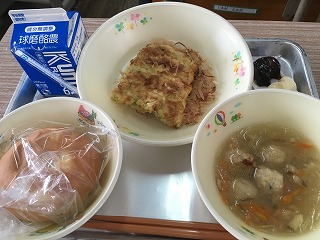 ・パインパン、お好み焼き、中華つくねスープ、牛乳 《献立ひとくちメモ》 ・今日のお好み焼きには、やまいもを入れています。やまいもには、ビタミンB1、ビタミンC、カルシウム、カリウムなどが豊富に含まれています。中国では「山の薬」、日本では「山のうなぎ」といわれ、縄文時代以前から食べられていたそうです。 【1年2組の給食の様子】 ・おいしい給食を前に、みんないい笑顔でした。 |