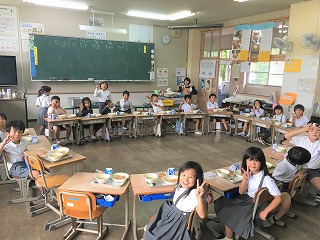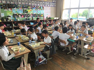 | ☆10月1日月曜日 《献立》 ・麦ごはん、さつま汁、がんバーグのジャポネソース、ごまあえ、牛乳 《献立ひとくちメモ》 ・さつまいもの主成分はでんぷんで、加熱すると一部が糖質に変わり甘みが増します。しかし、カロリーは米や小麦の三分の一程度と低く、ビタミンCや食物繊維が多く含まれているのでヘルシーな食品です。便秘を防いだり、大腸がんを予防したり、コレステロールを下げたりする働きがあります。 【6年2組の給食の様子】 ・先週まで、教育実習の江口先生と一緒に食べていたのですが、大学へ帰られ、ちょっぴり静かな6年2組の教室でした。 |