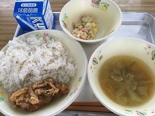 | ☆10月11日木曜日 《献立》 ★植柳幼稚園職員リクエスト給食 ・麦ごはん、春雨スープ、から揚げ、ツナサラダ、牛乳 《献立ひとくちメモ》 ・春雨は、緑豆やじゃがいも、さつまいもから作られる乾麺です。細く透明な形状から張るの雨を連想し、春雨と名付けられました。今日は、歯ごたえがある緑豆春雨を、豚肉やたっぷりの野菜と一緒にスープに入れています。 【3年2組の給食の様子】 ・大きな鶏の唐揚げがありました。子供たちに大人気でした。 |