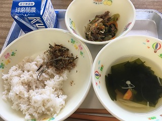 | ☆10月10日水曜日 《献立》 ・麦ごはん、スタミナスープ、高野豆腐の卵とじ、中華ふりかけ、牛乳 《献立ひとくちメモ》 ・中華ふりかけは、中華メニューの日に合うように工夫したふりかけです。和風のふりかけの時は、糸かつおを使用しますが、中華ふりかけでは、干しわかめを使い、しょうゆを控えめにして、ごま油をきかせて仕上げています。香りを楽しんで食べて下さい。 【3年1組の給食の様子】 ・中華ふりかけをご飯と混ぜて食べました。香りがよくて、おいしかったです。 |