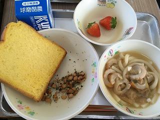 ・かぼちゃパン、きつねうどん、のりみそ豆、くだもの、牛乳