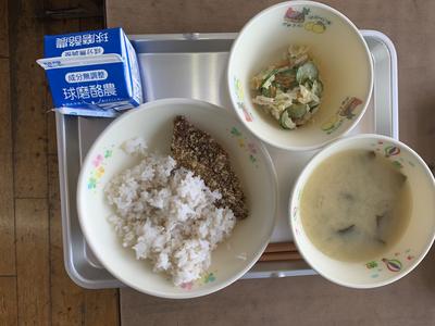 麦ごはん、ごまマヨネーズあえ、補記の天玉あげ、みそ汁、牛乳
