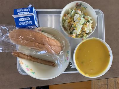 ウインナーのカクテルソース、カットパン、コールスローサラダ、かぼちゃスープ、牛乳