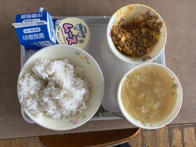 麦ごはん、ドライカレー、野菜スープ、ムース、牛乳