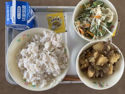 ・麦ごはん、一食ふりかけ、切り干し大根の酢の物、肉じゃが、牛乳