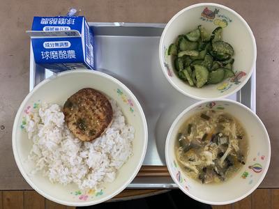 豆腐ハンバーグの中華あんかけ、きゅうりのピリ辛、中華コーンスープ、麦ごはん、牛乳