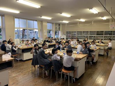 今日のいずかし給食は4.5.6班でした。雨だったので家庭科室での給食でした。