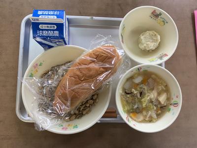 豆腐シューマイ、ミックスかりんとう、八宝菜、パン、牛乳
