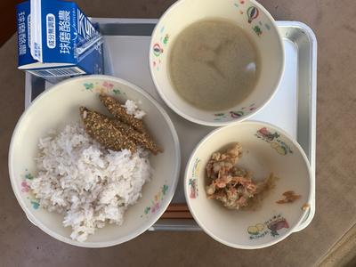 カリフラワーのごま和え、きびなごフライ、麦ごはん、さつま汁