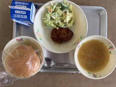 コールスローサラダ、セルフバーガー、オニオンスープ、牛乳