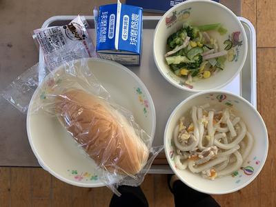 ブロッコリーサラダ、ミルクパン、親子うどん、牛乳
