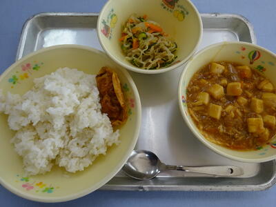 麦ご飯、揚げ餃子、麻婆豆腐、中華和え、牛乳(718kcal)