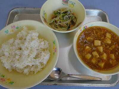 麦ご飯、麻婆豆腐、バンサンスー、牛乳(619kcal)
