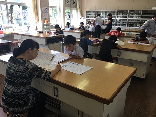 | ☆8月25日(金) ○「サマースクール(学習会)」がありました ・夏休みの課題が終えられるようサマースクールを開催しました。期間は3日間です。 【理科室;開校式の様子です】 ・地域学校協働本部の学習コミュニティーの方々が4名、学校応援団の方が1名、計5名来てくださいました。 【高学年;プリントの○つけ】 【低学年;プリントの○付け】 【高学年;プリントの○つけ】 【低学年;わからない時は解き方を指導】 ・実際のお金を使って、大きな数の考え方を教えてくださっていました。 【低学年;先生も一緒にしました】 ・担任の先生や理科の先生たちもプリントの○つけや解き方の指導をしました。 |