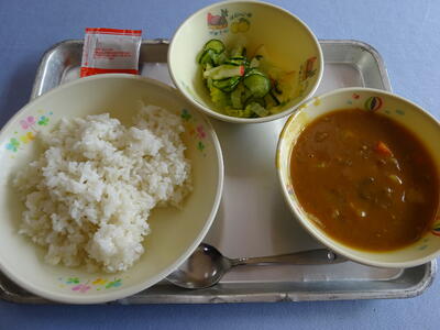 麦ご飯、ビーフカレー、白菜とリンゴのサラダ、ミルメーク、牛乳(609kcal)