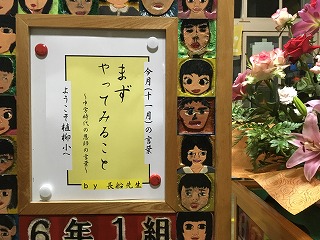 | ☆平成30年11月8日(木) 〇今月(11月)の言葉 ・5年2組の担任が、中学校時代に出会われた恩師の言葉です。 「まず やってみること」 【玄関にある案内版】 〇いずかし給食(6年2組と1年2組) ・4回目のいずかし給食がありました。今日も晴天でした。 【仲良く、おいしく食べました】 【9人の大人数で食べました】 ★「いずかし交流給食」は、来週2回で終了です。来種は、地域の方をお招きして、3・4年生がいっしょに食べます。おまちしております!! |
