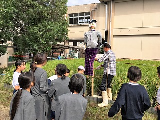| ☆10月24日(火) ○田んぼに案山子をたてました ・今日も田んぼの話題です。もうすぐ稲刈りですが、かかしが完成しました。 【パーカーを着た現代風のかかしです】 ・骨組みは用務の白石先生が作り、服や表情は5年生が担当しました。 【ありがとうございました】 【5年生全員で記念写真をパチリ!】 ○植柳小あれこれカメラ 【4年生理科;アルコールランプの使い方】 ・みんな恐る恐るマッチをすり、ランプをつけていました。 【昼休み;宝暦萩原堤の練習風景】 ・お殿様やお侍さんなど、偉い身分の人たちの動きの練習でした。 |