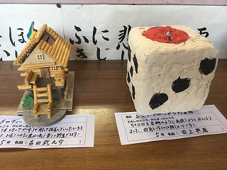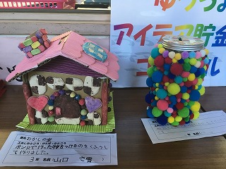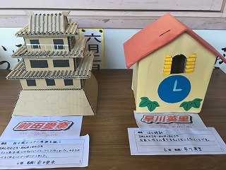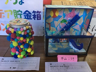 | ☆10月1日(日) ○アイデア貯金箱を紹介します ・職員室横に掲示しています。各学級1点の貯金箱があります。 ・全校で96点の貯金箱の出品があり、各学年1点をコンクールに出品しました。 【1年生の作品】 【2年生の作品】 【3年生の作品】 【4年生の作品】 【5年生の作品】 【5,6年生の作品】 |