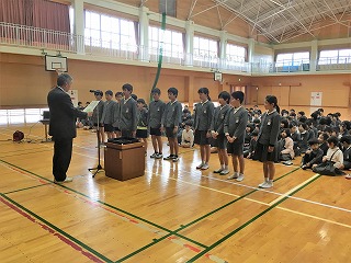 | ☆平成30年3月2日(金) ・校長先生の話と表彰がありました。 ★校長先生の話 【校長先生の話「おじぎの美】 ・お辞儀の文化や歴史、どんなお辞儀があるのか、話をされました。 【校長先生の話;お辞儀の種類「礼」】 ・運営委員会の子どもたちが、「会釈」や「礼」、「最敬礼」など、実演してくれました。 ・「おじぎの美」を意識して、あいさつができるといいですね。 ★表彰 【ハートフル委員会主催「くつのかかと調べ」表彰】 ・2年2組、5年、6年の3学級が、特にきれいに靴のかかとを揃えていました。 【感謝状;盆踊り保存会より】 ・伝統文化教室で、盆踊りや棒踊りを学んだ子どもたちが感謝状をもらいました。 【陸上部の表彰】 ・3年の鍛島君、渕田さん、5年の稲垣さんが表彰されました。 【卓球部の表彰】 ・個人戦や団体戦で、数多く表彰されました。毎回好成績です。 【サッカー部の表彰】 ・1部(U-12)Bパートで優勝しました。5,6年生のサッカー部員が表彰されました。 ★八代小学生スポーツ大会で、植柳小の子どもたちが大活躍しました。おめでとうございます。 |