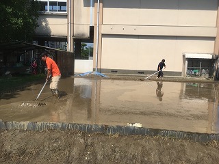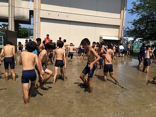 | ☆平成30年6月25日(月) ・毎年、学校の田んぼで稲を育てています。今年も、JAの方に指導していただき、稲を育てます。 【学校田の様子】 ・汚れてもいいように、水着で活動しました。 【みんなで代掻き】 ・「代掻き」とは、田んぼに水を入れて、土を砕いてかきならす作業です。5年生の足で代掻きしました。 【泥だらけになった男の子たち】 ・「土が気持ちいい!」「楽しい!」と、普段は触れることの少ない土の感触を、みんな楽しんでいました。 【JAの方が仕上げ】 ・最後は、レイキを使って、JAの職員の方にきれいにならしていただきました。 【JAの方のお話】 ・あらかじめ土には肥料が入れてあり、水と一緒によく混ざりました。水曜日に田植えをします。またがんばりましょう。 ★お忙しい中、ご指導ありがとうございました。 |
