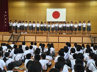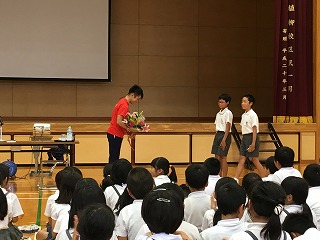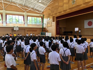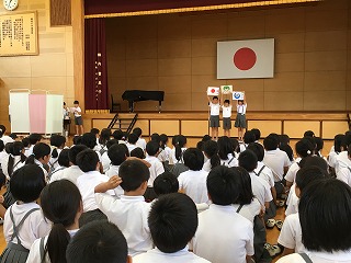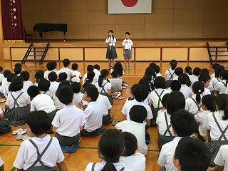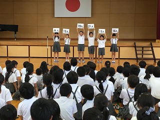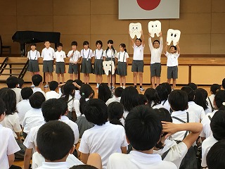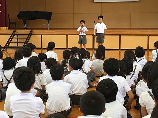 | ☆平成30年6月15日(金) ・お昼休みのあと、体育館で児童集会がありました。 ①保健委員会の発表 ②ハートフル委員会からのお知らせ ③運営委員会からのお知らせ ④6年生の発表 ⑤今月の歌 ★①保健委員会の発表★ ・6月4日は「むし歯予防デー」。歯について、保健委員会が発表をしました。 【各学年のむし歯がある人の数】 ・1年生(16人)、2年生(13人)、3年生(21人)、4年生(19人)、5年生(13人)、6年生(8人) 【一人あたりの虫歯の平均数】 ・1位(日本全体の平均数)、2位(植柳小の平均数)、3位(八代全体の平均数)。八代市では、むし歯が少ない学校といえます。 【保健委員会からのメッセージ】 ・「80歳、90歳、100歳になっても、食べ物がおいしく食べられて、大きな口を開けて、笑って楽しく、元気に過ごすことができるよう、歯を大切に過ごしてください。」 ★②ハートフル委員会からのお知らせ★ 【ハートフル委員の6年生】 ・「来週から『ろう下を走らないキャンペーン』をします。走っている人がいたら、私たちが止めます。みなさん、ろう下は歩きましょう。」 ★③運営委員会からのお知らせ★ 【運営委員の5年生と6年生】 ・代表委員会で決まったことをお知らせしました。 ・「学級の旗を作ります。クラスの写真、目標、全員の名前を書いてください。」 ★④6年生発表★ 【6年生全員がステージに】 ・6月28日(木)~29日(金)、長崎へ修学旅行に行きます。平和学習で学んだことを発表し、「♪折り鶴」の歌を歌いました。 ★⑤今月の歌★ 【今月の歌をみんなで歌いました】 |
