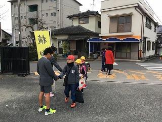 ハートフル委員会の児童と交通指導の先生が子供たちを出迎えました。