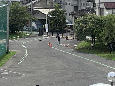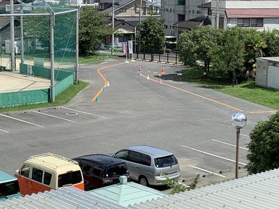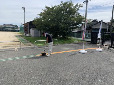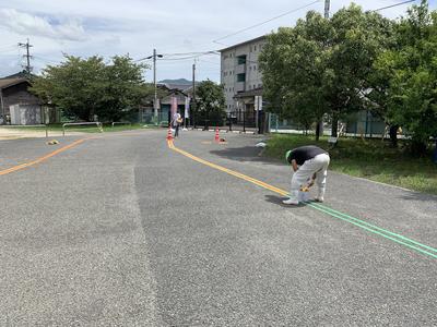 〇南門側の駐車場に、児童が通る道と送迎用の車が通る道を示すラインを引いています。
