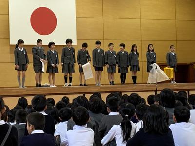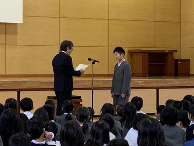 剣道の大会で優勝した児童の表彰がありました。