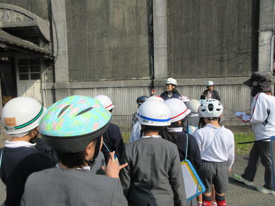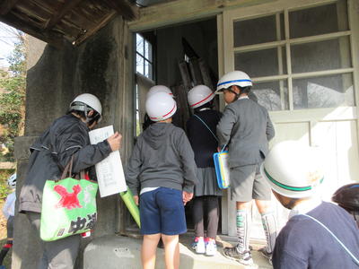 旧講堂は老朽化が進んでいますので、安全のためヘルメットをかぶって中に入りました。