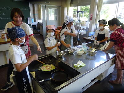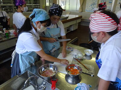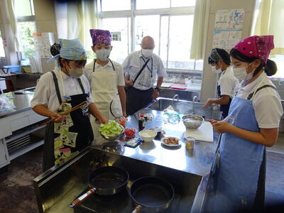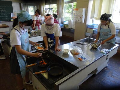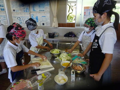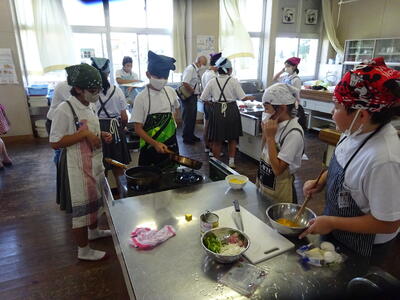 6年1組が「野菜炒め」の調理実習をしているところでした。