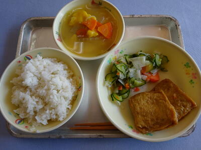 麦ご飯、肉しのだ、ゆず香あえ、かぼちゃのだご汁(606kcal)
