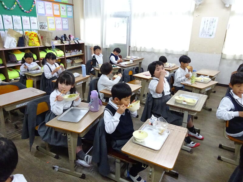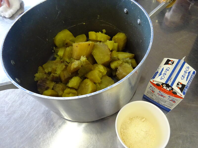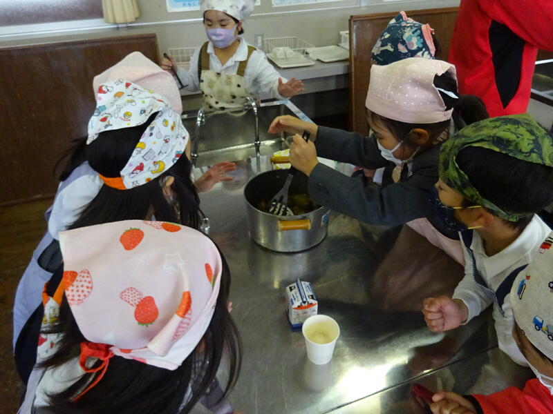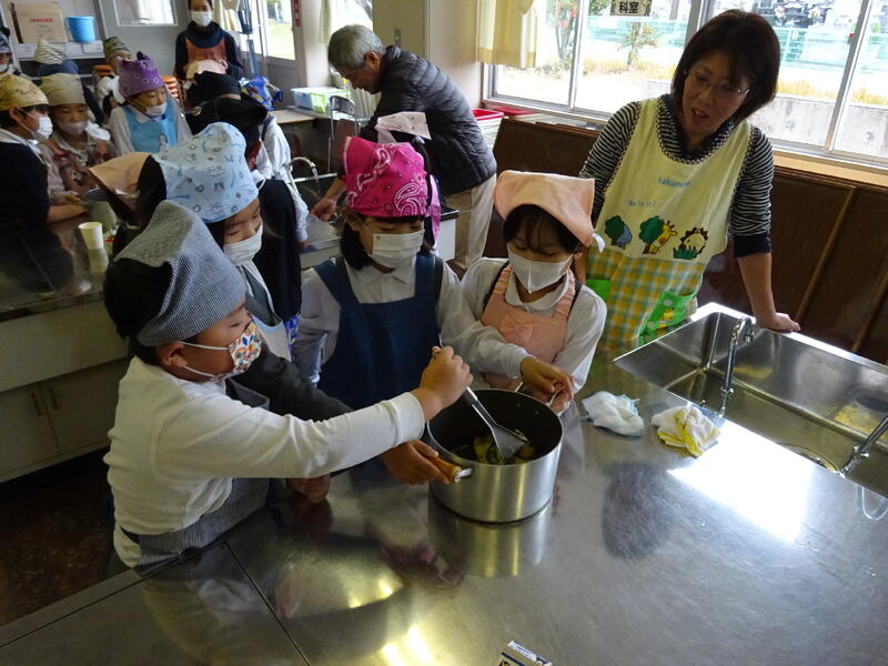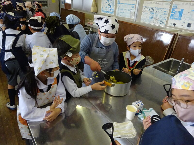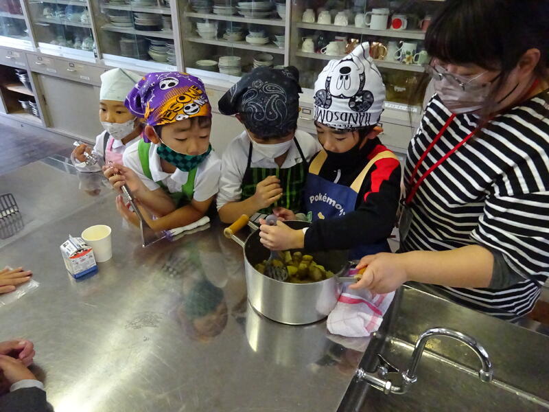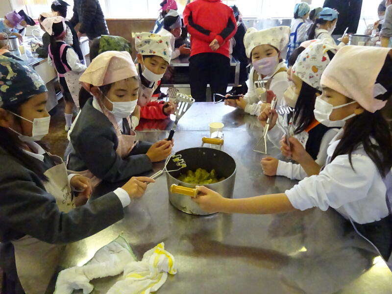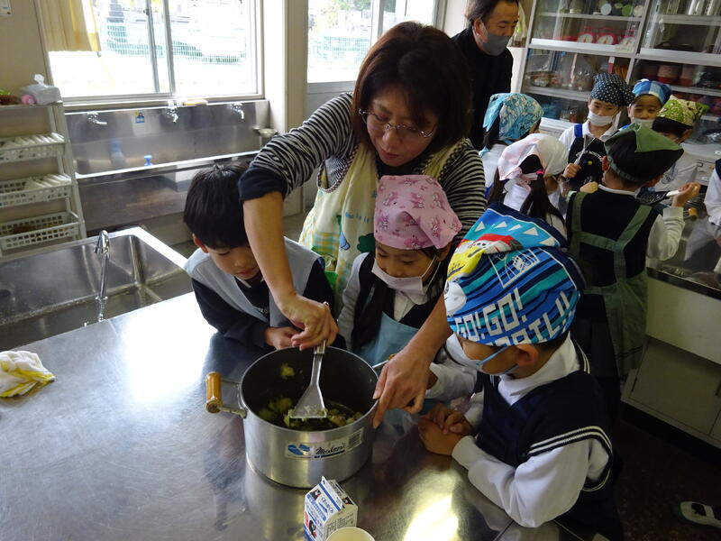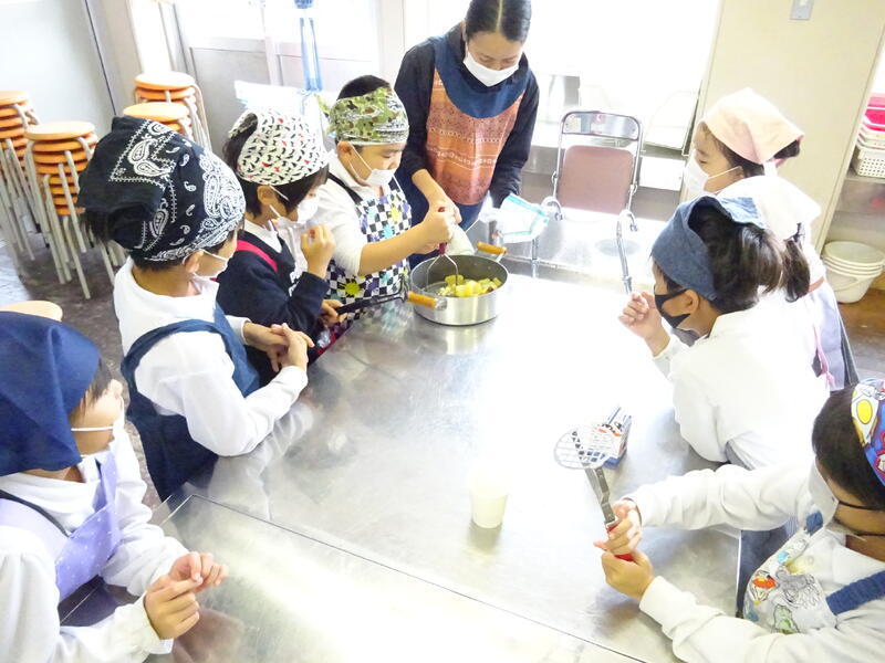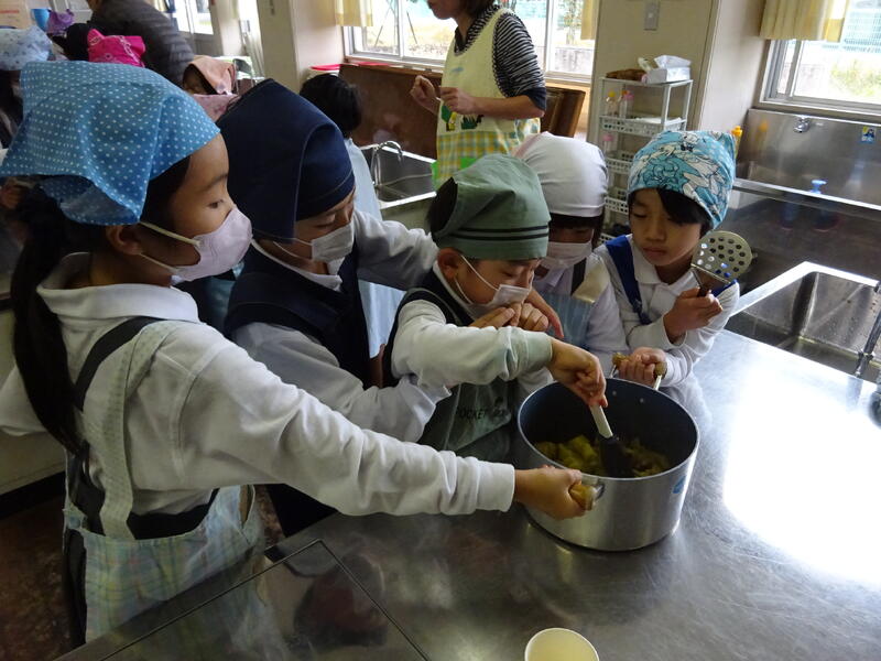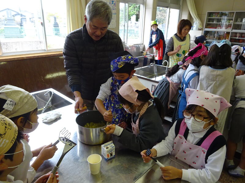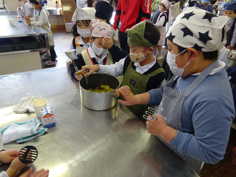 この日は、植柳コミニュティセンターから館長様をはじめ3名の方に調理のお手伝いをしていただきお芋パーティーが実現しました。できあがった物は給食と一緒に食べました。サポートに来ていただいた子ユニティセンターの職員の皆様、ご多用の中ありがとうございました。