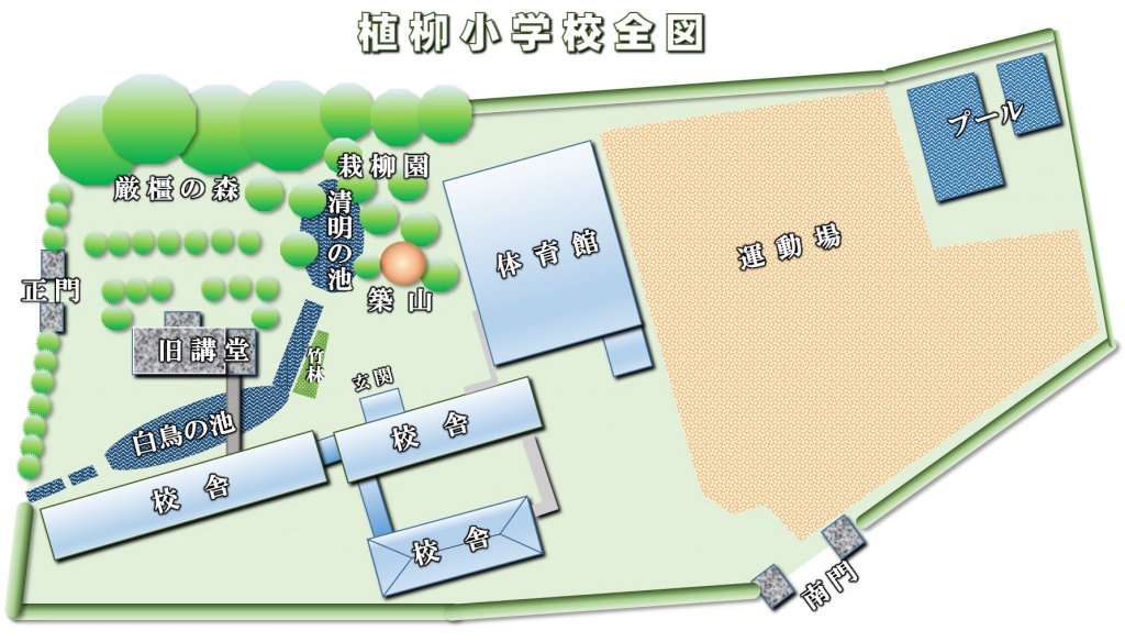 本校は、八代平野の中央球磨川の河口南側に位置し、その流れを校区から展望できる好条件に恵まれています。校内には厳樫(いずかし)の森・栽柳園(さいりゅうえん)があり多くの木々に囲まれ、大きな池(清明の池)もあり、自然と緑に囲まれています。